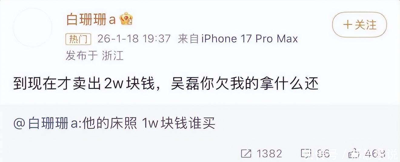 内娱刚开年,就又炸锅了。 一个叫“白珊珊a”的账号突然跳出来,一句“吴磊你欠我的拿什么还”,直接把热搜点着了。更离谱的是,她还扬言手握吴磊的床照,标价一万块出售,顺带踩了一脚赵露思,说她“做作”、爱点评男明星朋友圈。可没多久,就被粉丝打脸——赵露思压根不用朋友圈。